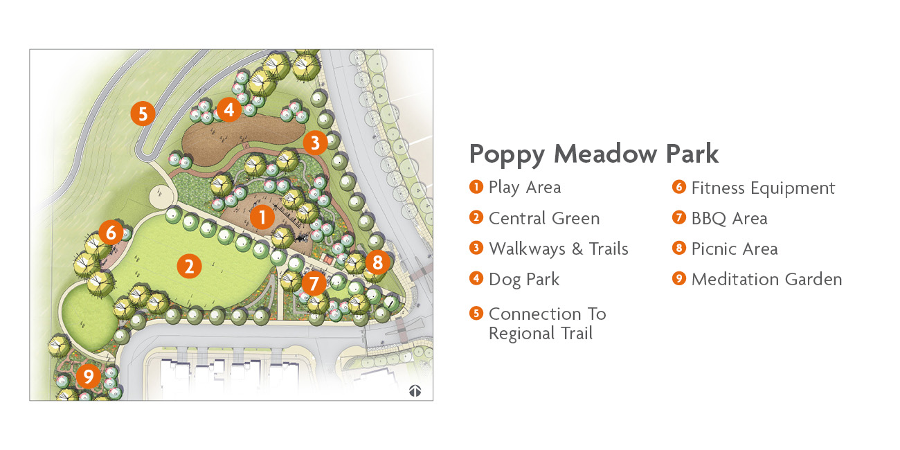 Poppy Meadow Park is nestled near the Orchid and Azure neighborhoods and is designed for fun, relaxation and everyday adventure. Take your furry friends to the dog park, enjoy a walk along the Regional Trail or find a quiet moment in the Meditation Garden. Whether you’re here to play, exercise or unwind, Poppy Meadow Park is ready to welcome you.